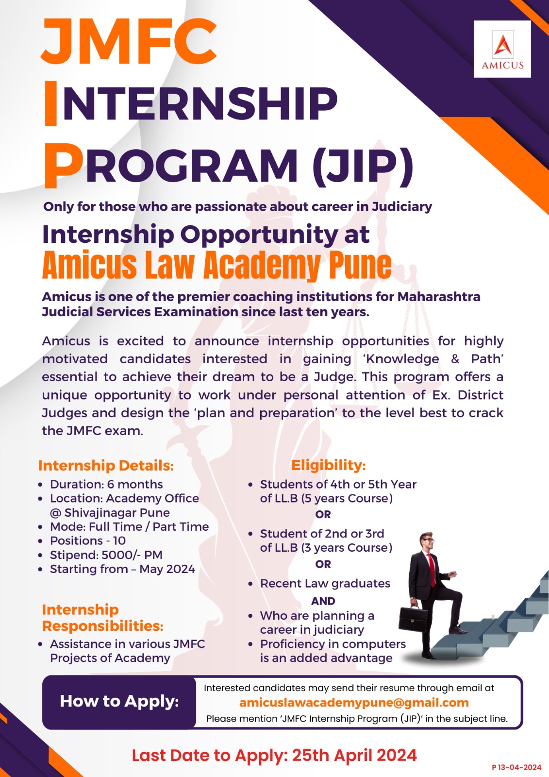 Amicus is excited to announce internship opportunities for highly motivated candidates interested in gaining ‘Knowledge & Path’ essential to achieve their dream to be a Judge. This program offers a unique opportunity to work under personal attention of Ex. District Judges and design the ‘plan and preparation’ to the level best to crack the JMFC exam.
